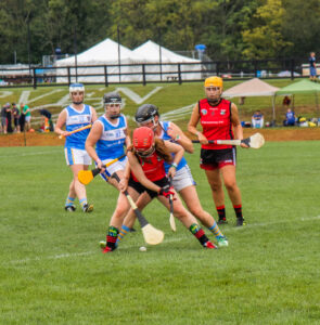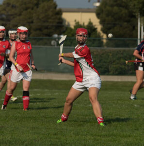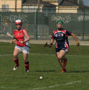 Camogie (ka-moe-gi) is an Irish team sport sport played with a wooden stick (hurley) and a small ball (a Sliotar). It is very similar to the men’s version, hurling, but has a few key differences, mostly relating to scoring and tackling.