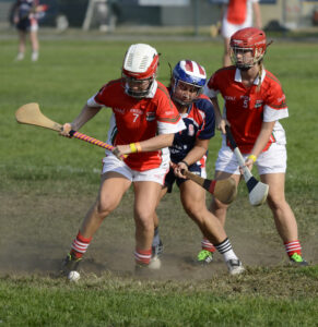 Camogie (ka-moe-gi) is an Irish team sport sport played with a wooden stick (hurley) and a small ball (a Sliotar). It is very similar to the men’s version, hurling, but has a few key differences, mostly relating to scoring and tackling.